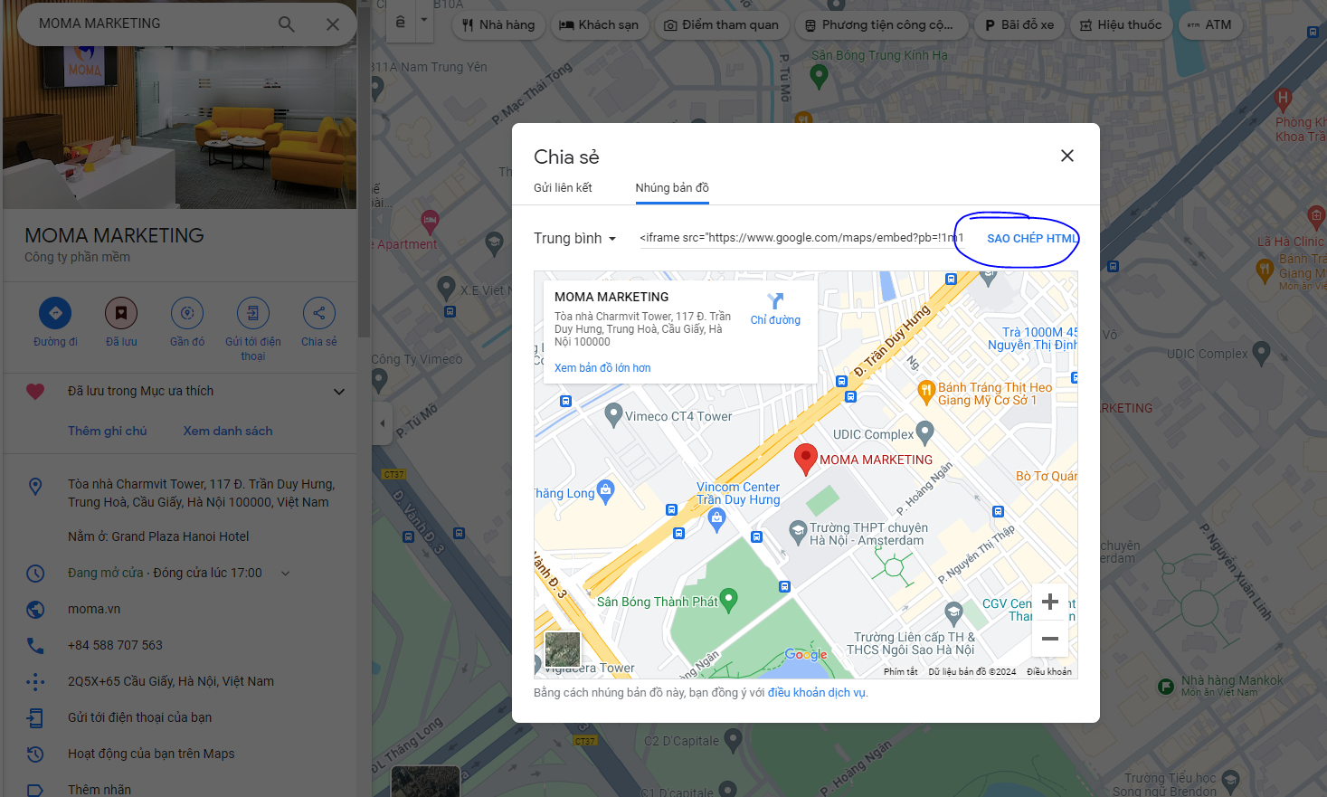 Để nhúng bản đồ Google Maps của công ty lên website MOMA một cách chính xác, bạn có thể làm theo các bước sau: