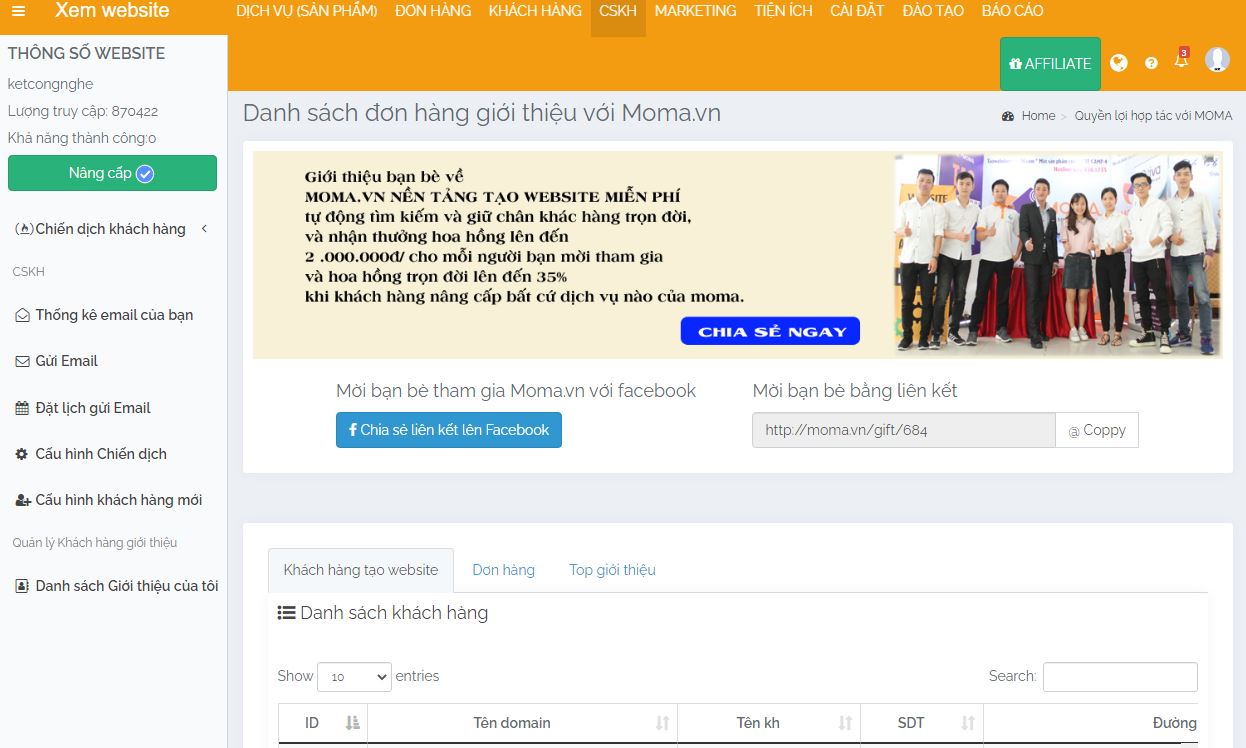 Đăng ký chiến dịch trên hệ thống Moma và tạo link tiếp thị tương ứng |