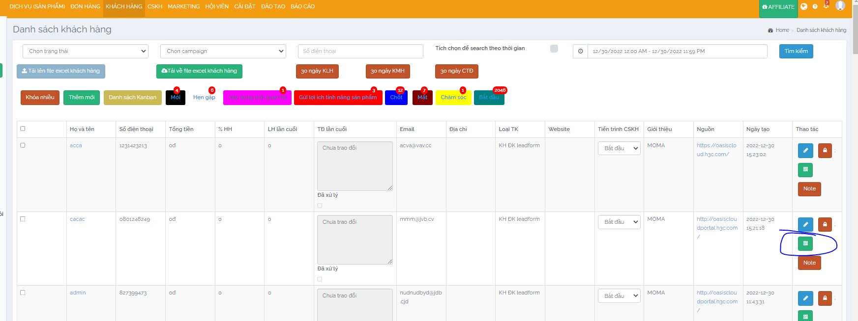 Giải thích: khi khách hàng cũ liên hệ lại hệ thống sẽ phát hiện đẩy lên đầu tiên: nhiệm vụ của sale là Note và bấm đã xử lý để khách hàng về tiến trình