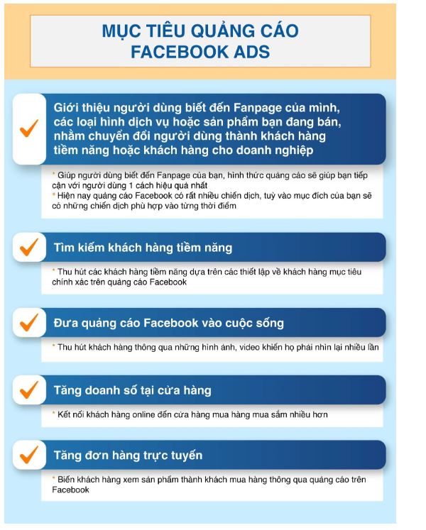 Tăng mức độ nhận diện thương hiệu, Tìm kiếm khách hàng tiềm năng, Đưa quảng cáo Facebook vào cuộc sống, Tăng doanh số tại cửa hàng, Tăng đơn hàng trực tuyến